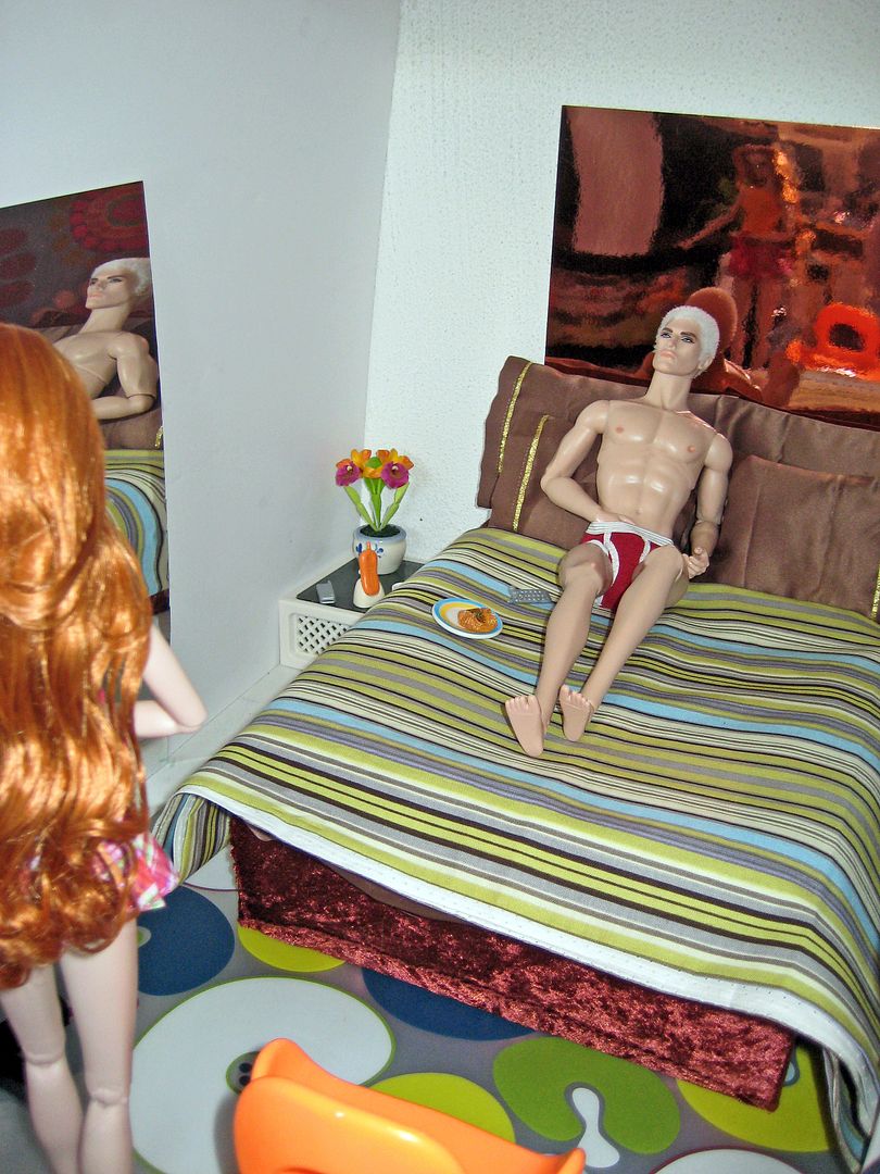 "Hi, darling.... you look flushed? You OK???" Luke smiles at her from the bed where he's watching sport on TV.